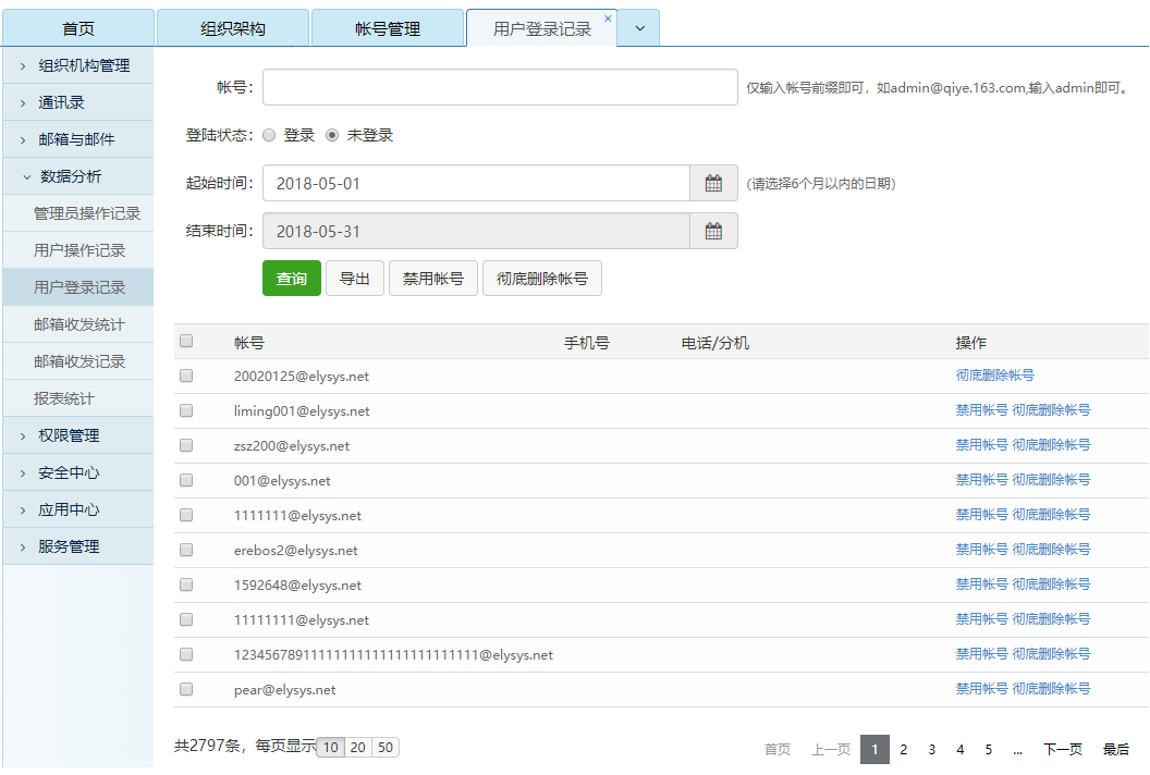 (2)可对长时间未登录帐号进行禁用、彻底删除操作。