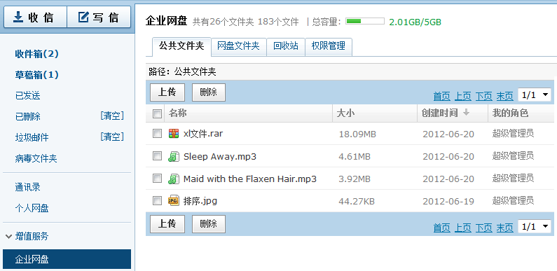 1)新增“公共文件夹”功能:默认域下全部员工帐号都可以直接访问,并下载里面的文件。
